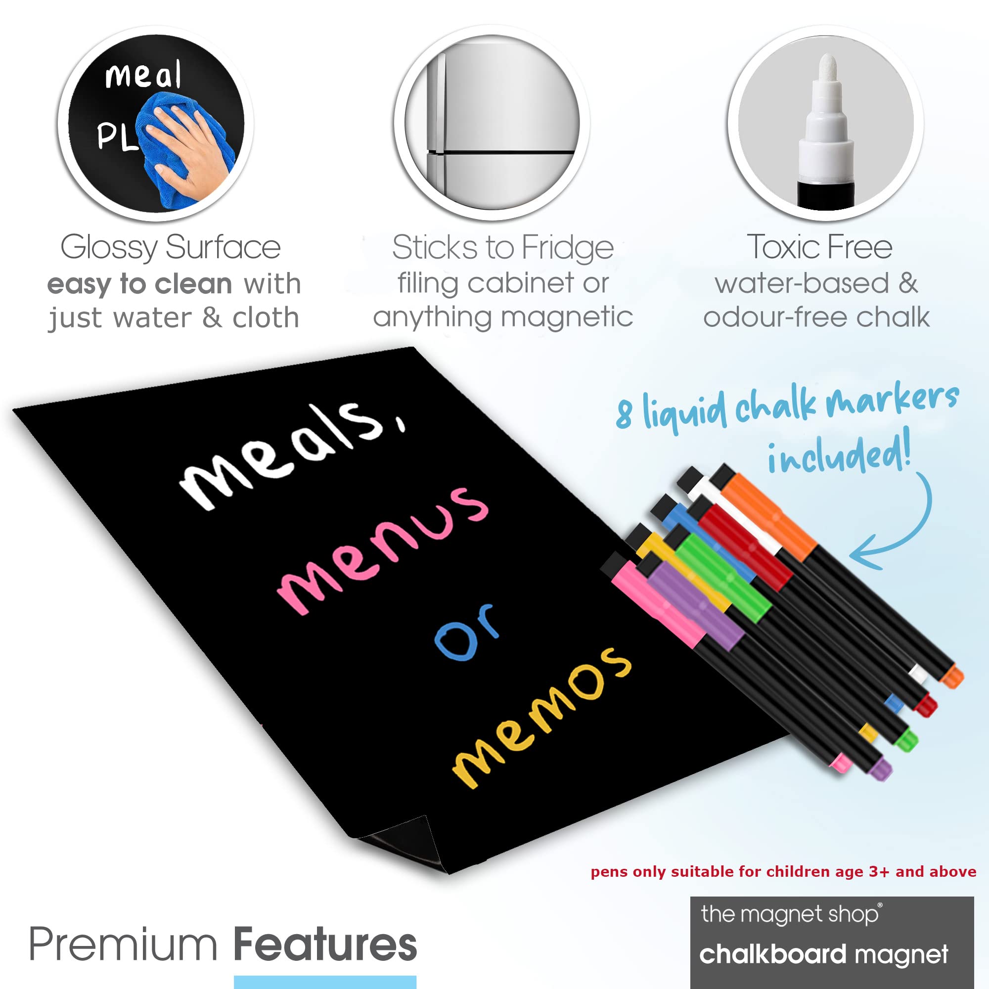 TMS Blackboard Magnet for Fridge | A4 Magnetic Chalk Board Sheet with Dry Wipe Colour Chalk Pens | Black Memo Board | Kitchen Notice Board for Notes, Reminders or Weekly Meal Planner [30 x 21cm]