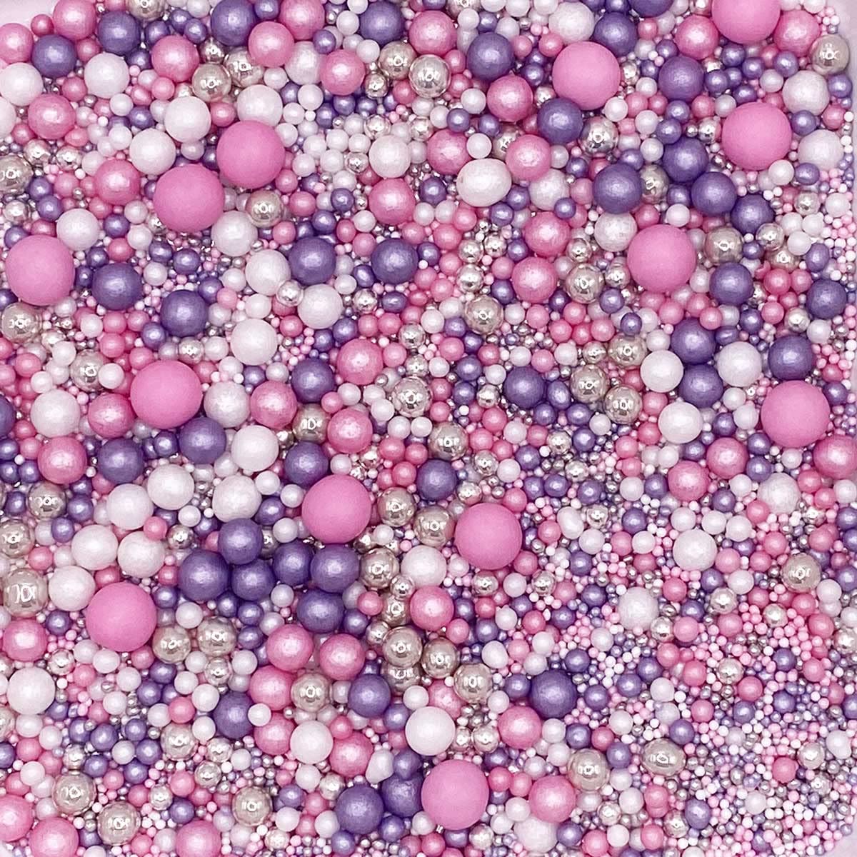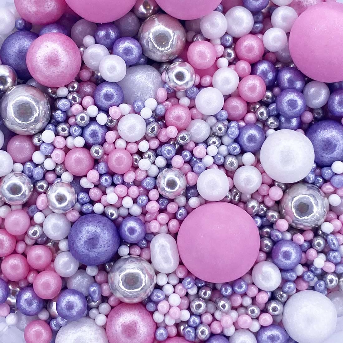 - PEARL MIX - glimmer pink, violet and mother of pearl pearls, matt pink chocoballs and high shine silver pearls. Create a dramatic encrusted effect on large cakes and sprinkle on cupcakes for a decadent decoration