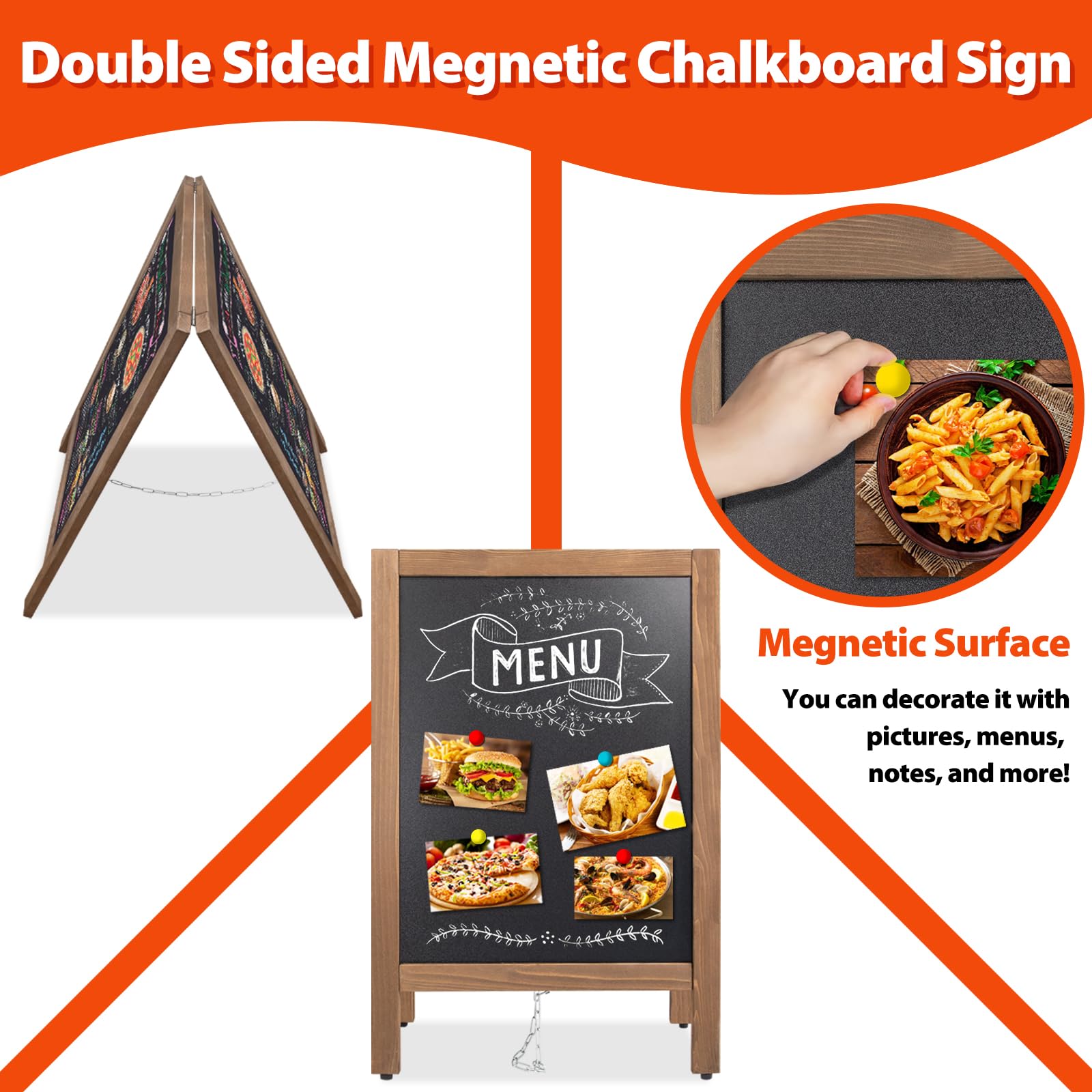 - 🔥Double Sided Magnetic Chalkboard: VAllGO A-board pavement signs feature a double-sided surface, maximizing the display of advertising information. The magnetic surface allows you to attach pictures, menus, notes, and more! Please note: This is a SMALL SIZE board – Overall size: 43×65 cm; Chalkboard surface size: 36×48 cm