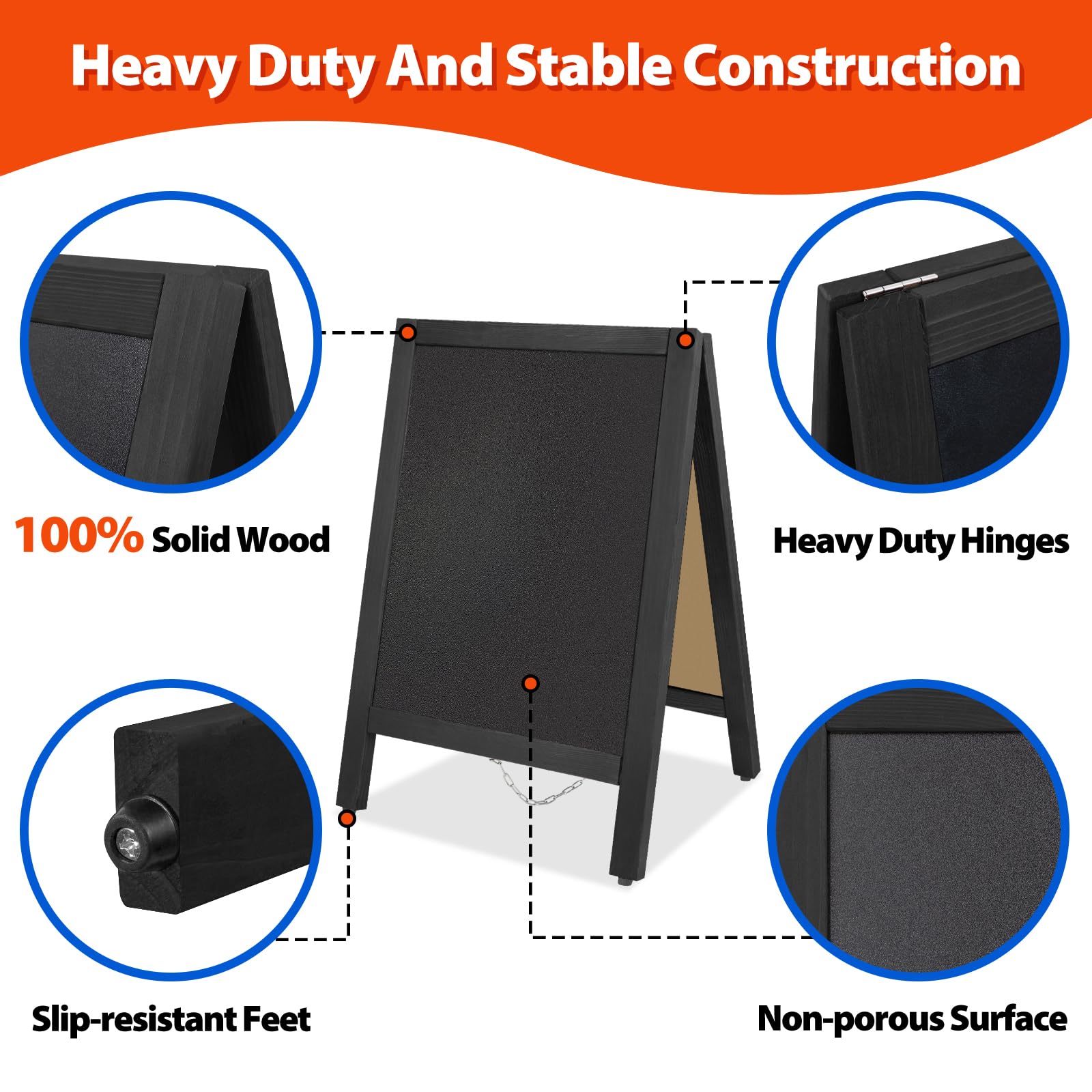 - 🔥Heavy Duty & Stable Construction:VAIIGO chalkboard signs is made of carbonized solid wood,sturdy and durable.Heavy-duty hinges help hold the chalkboard stably even in windy weather.Durable plastic slip-resistant feet that prevent it from tipping.