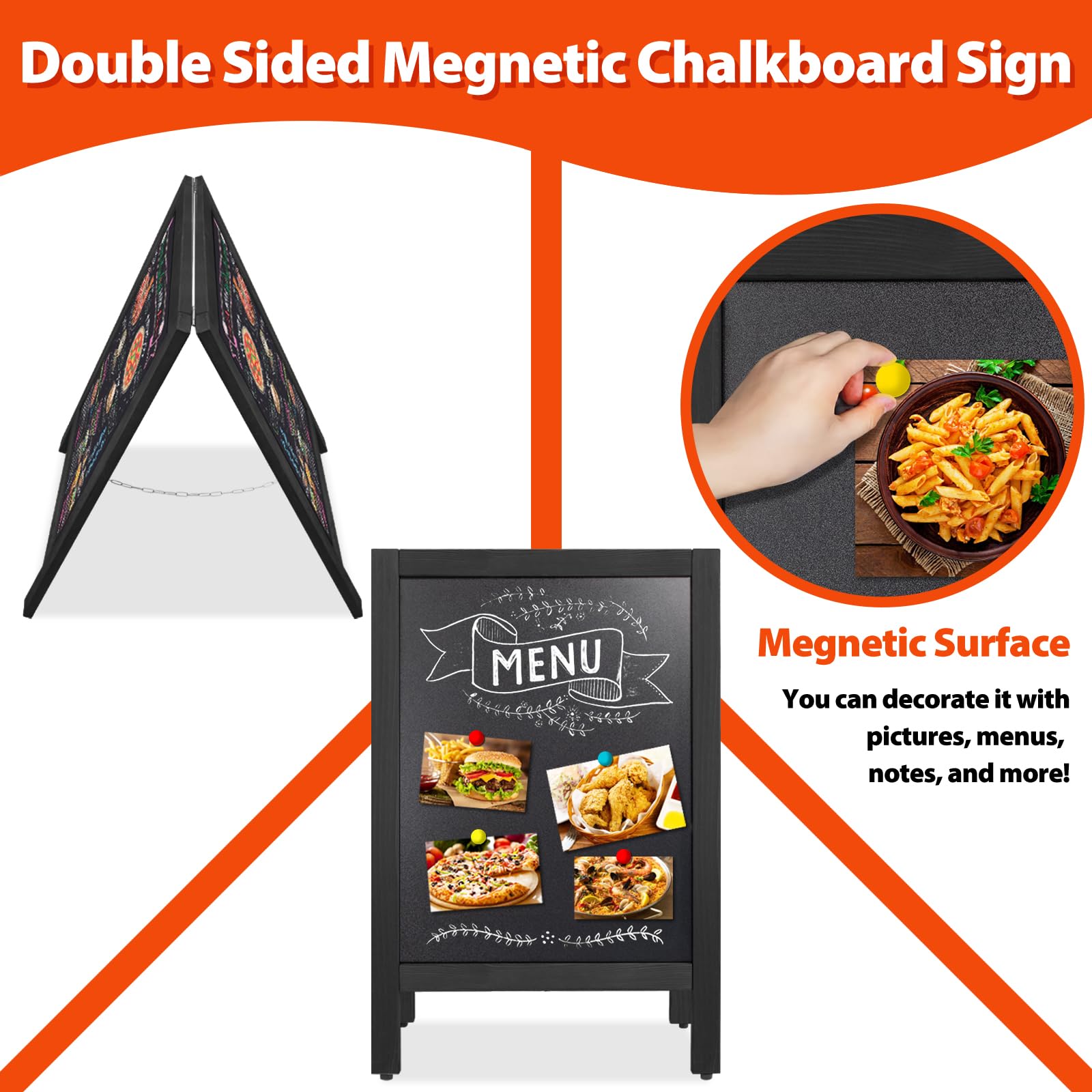 - 🔥Double-Sided Magnetic Chalkboard: VAIIGO A-frame chalkboard sign features a magnetic double-sided surface, allowing you to display menus, notes, photos, and promotions on both sides. Overall size: 43×65cm; writing surface: 36×48cm.