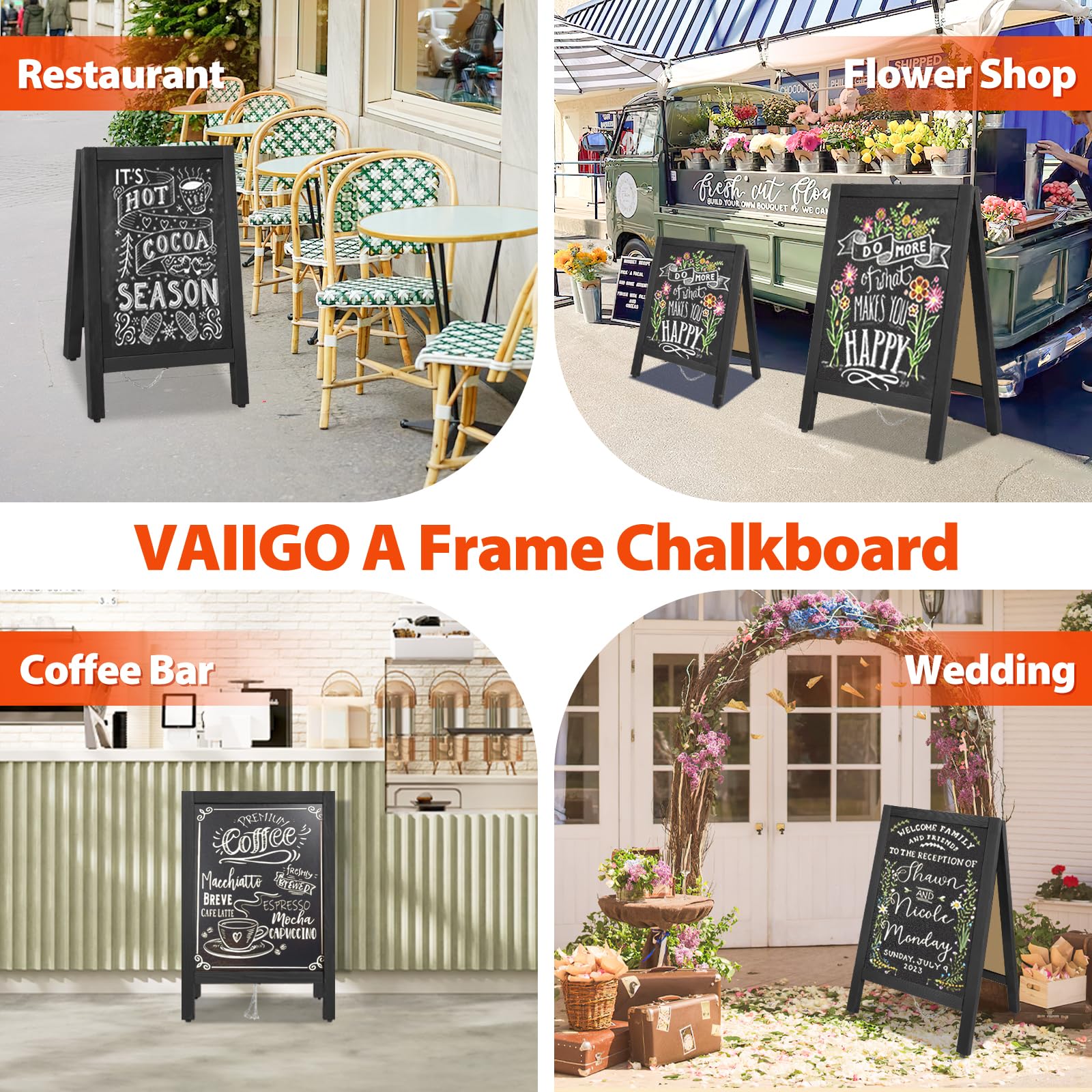 - 🔥Storage And Portability:VAIIGO chalkboard signs can be easily folded flat for easy storage and convenient transport.The free standing sandwich board Signs can be used anytime and anywhere without installation.