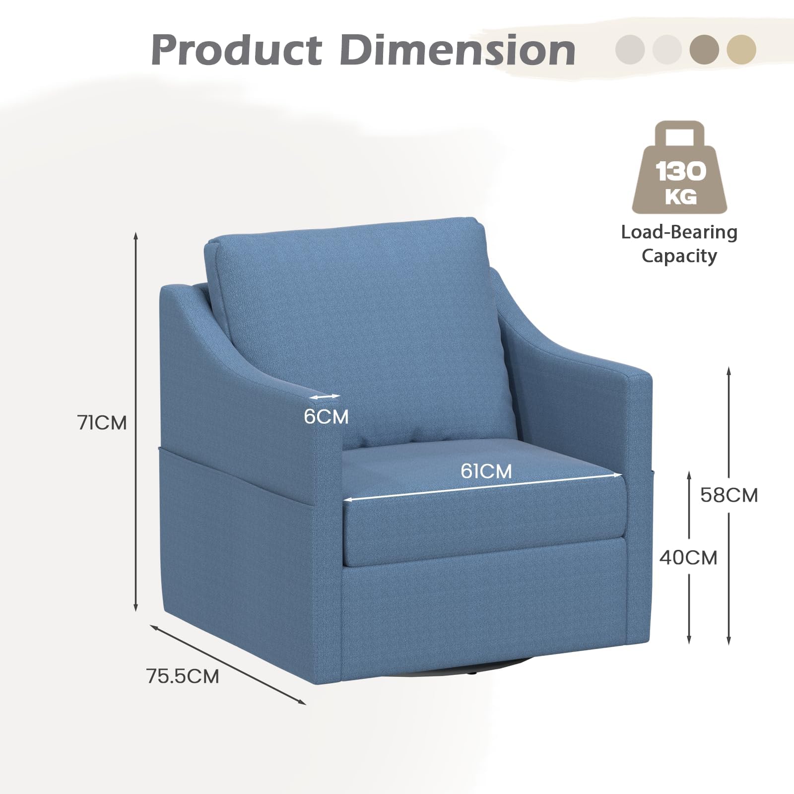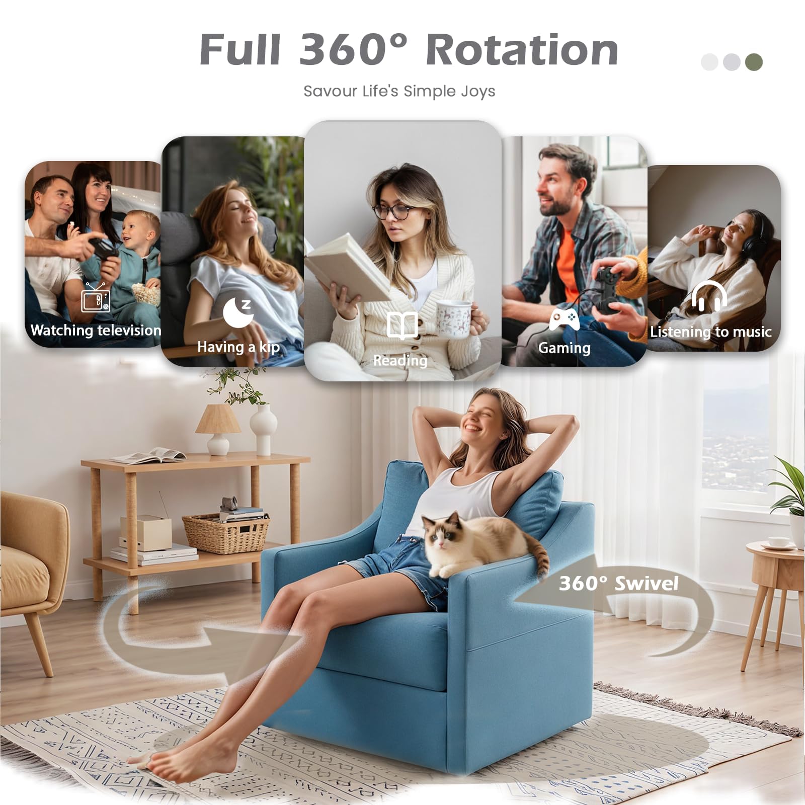 • 【Multi-scene Use】 360° swivel + rocking functions. Dimensions: 81.5×71.5×76cm. Perfect for small living rooms, bedroom bay windows, study corners.