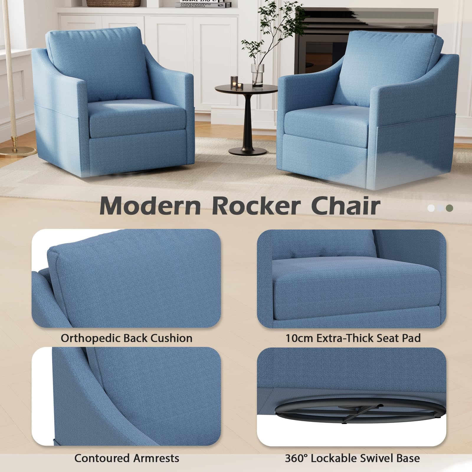 • 【Modern Swivel Rocking Chair】 The base is thickened by 6 cm for maximum stability, preventing tipping even when swiveling or rocking. It seamlessly combines 360° smooth rotation and gentle rocking functions for flexible use.